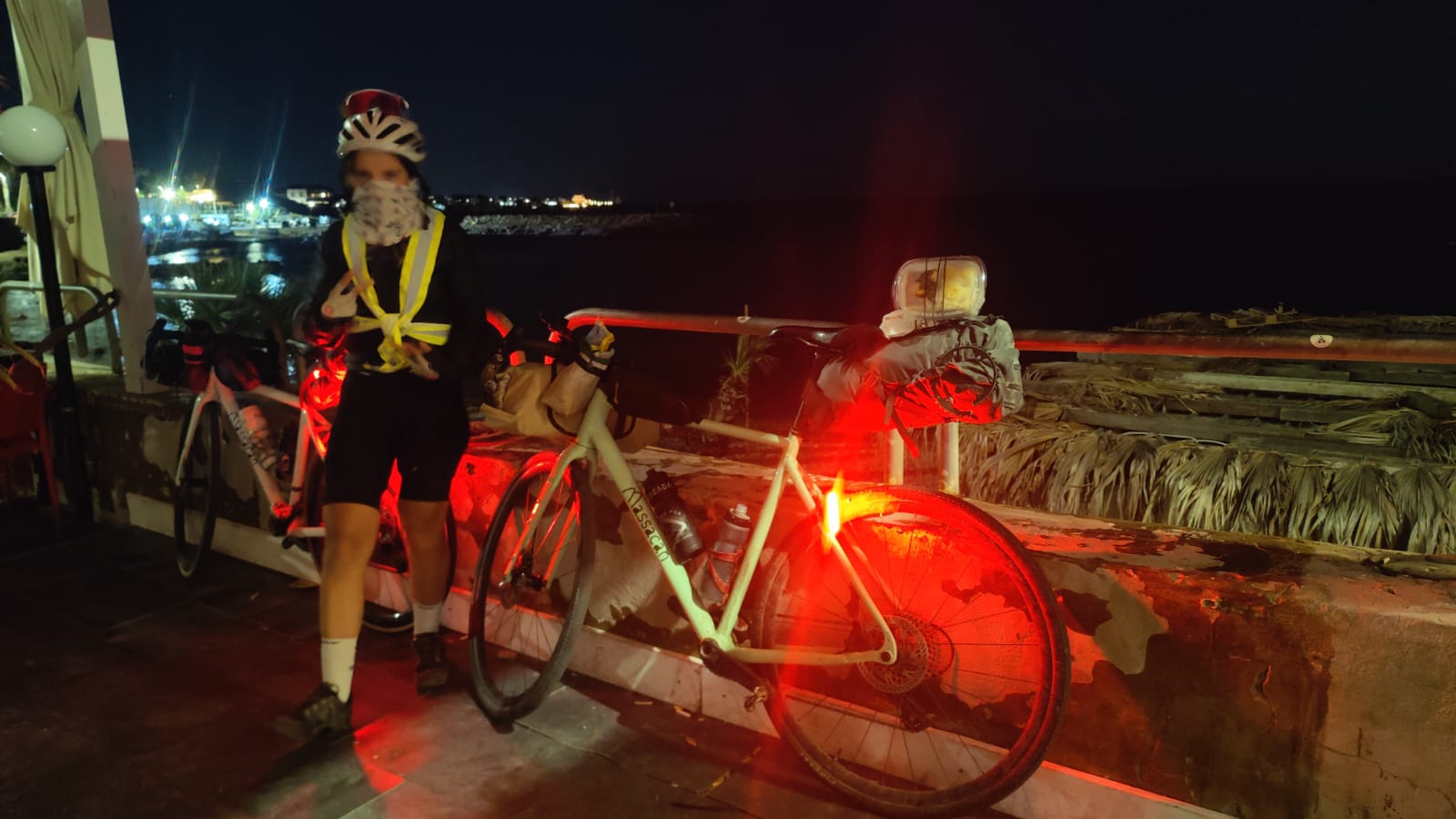 Puisque la nourriture était le réconfort de ce voyage , à Pise nous avons vainement profité d’une visite nocturne de la ville en passant devant la Tour après avoir dévoré une pizza ! Pour la suite, nous finirons de nuit, en profitant de discussion au milieu d’hôtels et plages luxueuses, de routes larges et inoccupées - quel bonheur, après avoir été écrasé la journée durant -, de l’air marin, sans oublier les sentiers de gravel. Par ailleurs, comme il est de tradition lors de nos aventures de longue distance, je n’oublierai pas de donner un coup de guidon pour envoyer Alex dans les orties, ce qui la laissera un peu fâchée !