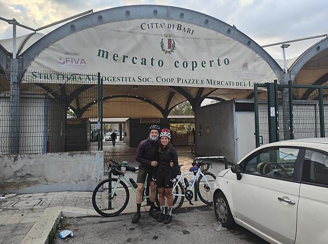 Le départ est lancé à 7h32 devant le marché de la Citta di Bari. Tandis que nous quittons rapidement la ville pour rejoindre de splendides zones industrielles, ainsi que de nombreuses routes jonchées de détritus en tout genre, nous nous heurtons également à la qualité somme toute "fabuleuse" des routes italiennes, ce dont nous avions été prévenu par Gégé le diagonaliste !