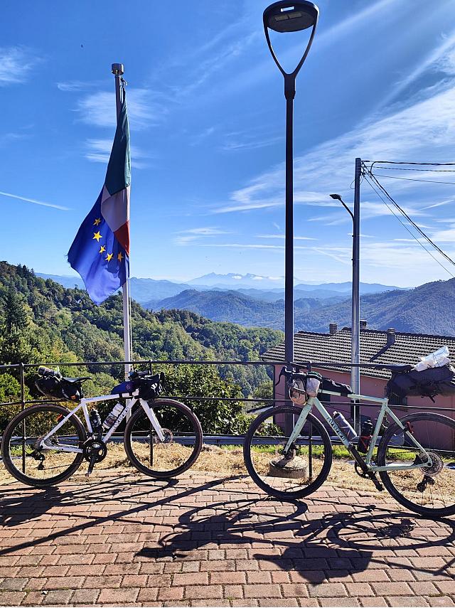 Nous passâmes plusieurs heures chez un vélociste, tentâmes d’en appeler d’autres, mais rien n’y fait. Devant cette même boutique, nous réparons une crevaison, car rouler en périphérie italienne, c’est rouler sur une infinie de morceaux de verres. Finalement, une fois passée l’idée d’abandonner, vient celle de changer de trajet pour éviter le dénivelé afin de poursuivre le voyage sur la plaque. Pile à ce moment, on apprend que Cicli Castellaccio sera notre sauveur et qu’il nous attend demain.