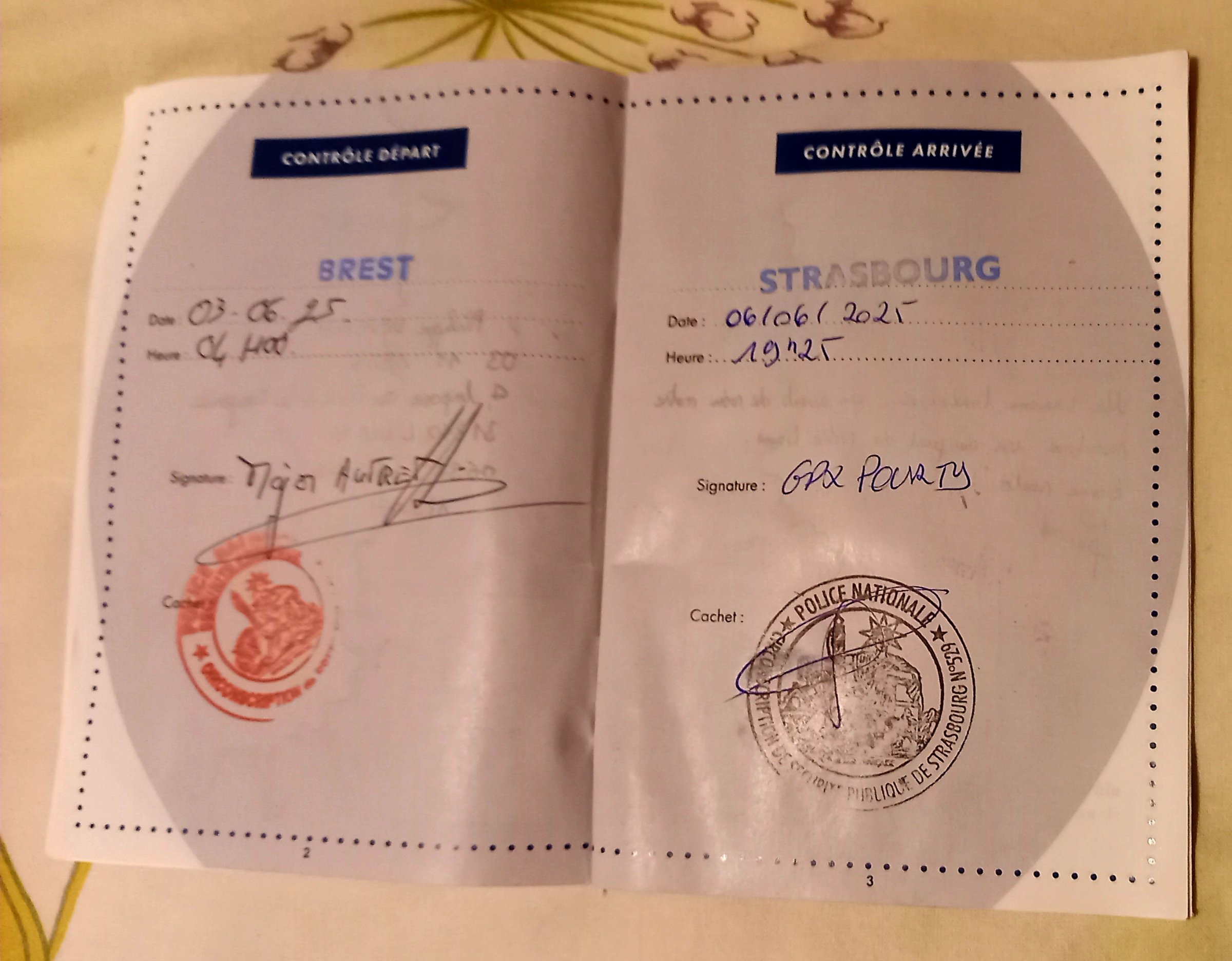 Encore quelques derniers efforts et le panneau de Strasbourg est en vue. Les derniers kilomètres pour arriver au point symbolique du Commissariat ne pèsent plus dans les jambes. Par miracle, nous pédalons avec légèreté dans la ville et la pluie s’est arrêtée. Un grand merci à Jocelyne et à Marc pour leur accueil. A Strasbourg, on savait que toutes les fatigues s’estomperaient et ce fut le cas.