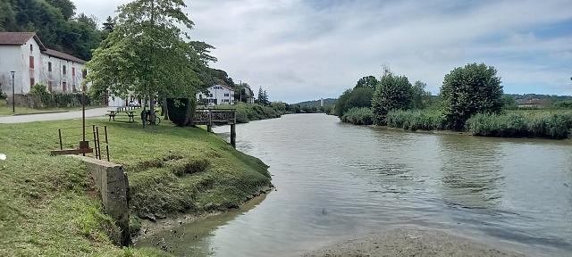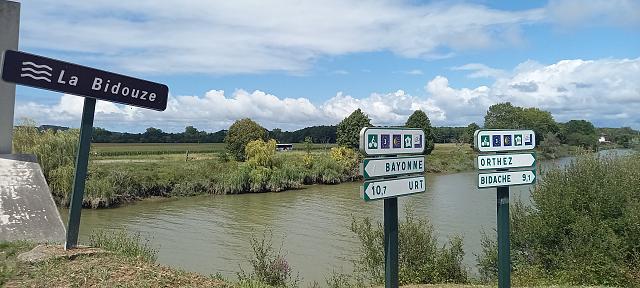 Réveil sous la pluie : la journée ne s’annonce pas sous les meilleurs auspices. Heureusement, le ciel finira par s’éclaircir. Nous poursuivons notre route en alternant ancienne voie ferrée, petites routes sinueuses typiquement basques, et enfin un chemin de halage longeant la Bidouze puis l’Adour. Ce soir, étape à Urt, en plein cœur du Pays basque